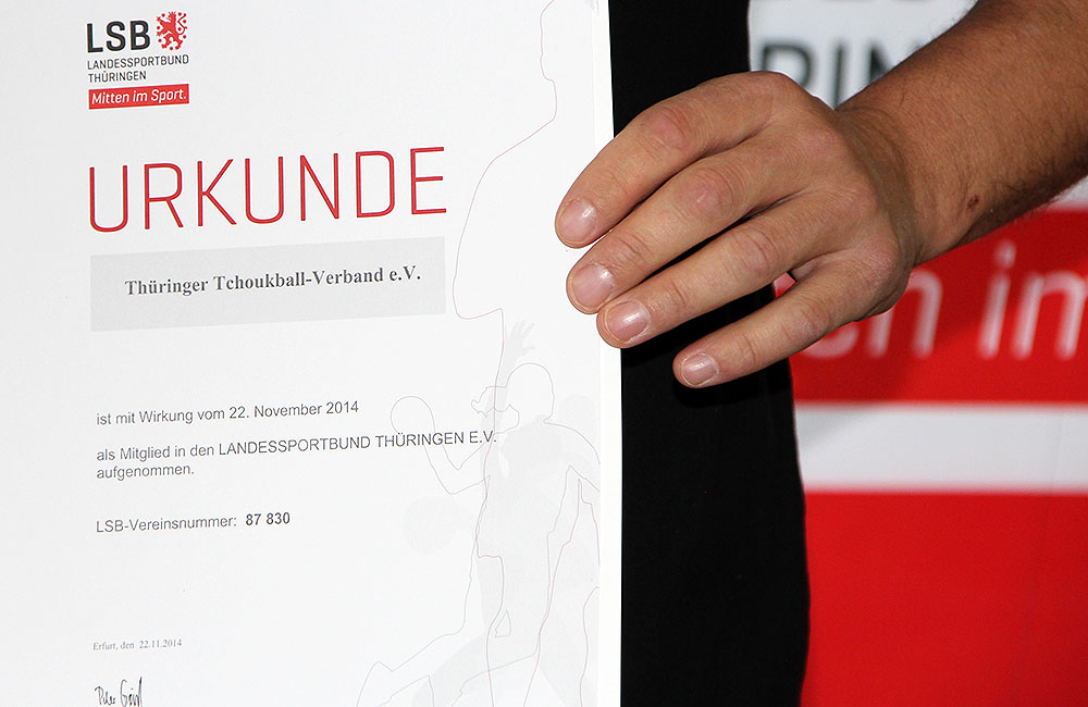 Es ist geschafft: Der Thüringer Tchoukball-Verband ist Mitglied des Landessportbundes (LSB) Thüringen. Im Rahmen der jüngsten Mitgliederversammlung in Bad Blankenburg überreichte LSB-Präsident Peter Gösel die Aufnahmeurkunde an die Vorstandsvertreter Stefan Anhalt und Tobias Pfeifer.